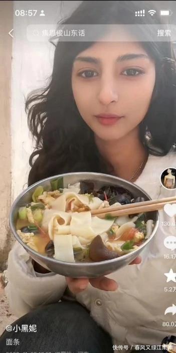 一次,她拍了吃河南烩面的短视 频, 镜头前,她年轻漂亮,身材高挑,妆容精致,简直是埃及艳后。